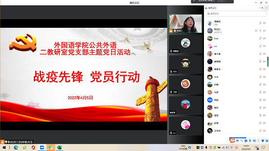 4月5日至4月7日,外国语学院四个教工党支部分别通过“腾讯会议”平台开展“战疫先锋,党员行动”主题党日活动。活动由各支部书记主持并讲话,教工全体党员参加会议。