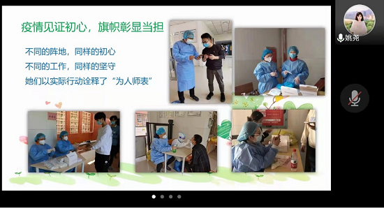 各支部书记总结支部和教研室在前期学院抗疫先锋队所做的工作,表扬了支部党员和教研室(科室)党员老师第一时间积极响应院党委招募志愿者的号召,加入抗疫先锋队,冲在疫情防控最前线,发挥了模范先锋作用,以实际行动践行了一个共产党员的初心和使命。从“疫情见证初心 旗帜彰显当担”和“心聚力 齐战疫”两个方面总结支部在战疫中涌现的感人故事和先进事迹,激发、教育全体教师,尤其是党员教师冲锋在前,勇于当担。一张张感人的照片、一幕幕志愿者忙碌的身影,都彰显学院教师在不同的阵地,坚守同样的初心,他们以实际行动诠释了“为人师表”的含义。