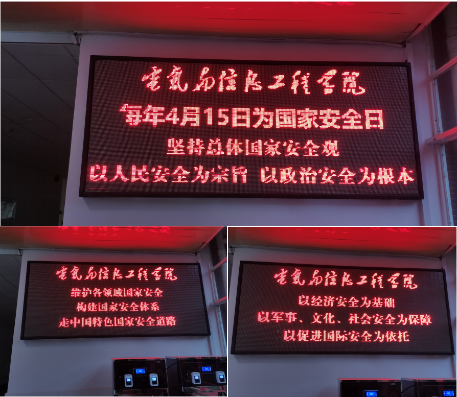 营造氛围,宣传国家安全意识。学院一方面利用户外电子屏播放国家安全法治宣传标语;另一方面,通过学院微信公众号“电光火时”宣传国家安全教育的知识,对国家安全法、反分裂国家法、国防法、反恐怖主义法、数据安全法、生物安全法、网络安全法等国家安全相关法律进行了重点介绍,大力宣传宪法规定的关于公民维护祖国安全、荣誉和利益的基本义务。