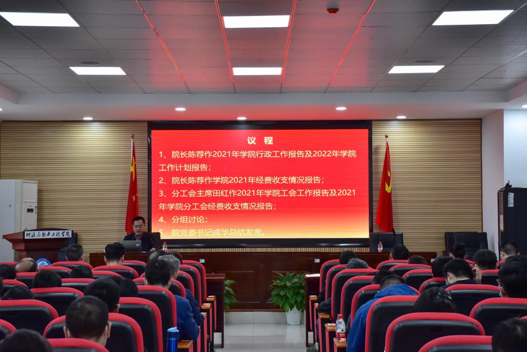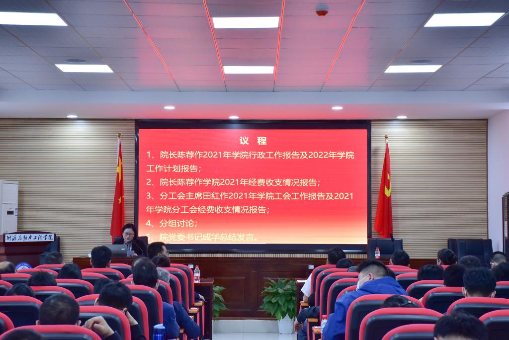 院长陈荐就2021年学院行政工作及2022年学院工作计划作报告,并报告了学院2021年经费收支情况。田红就2021年学院工会工作及2021年学院分工会经费收支情况作报告。